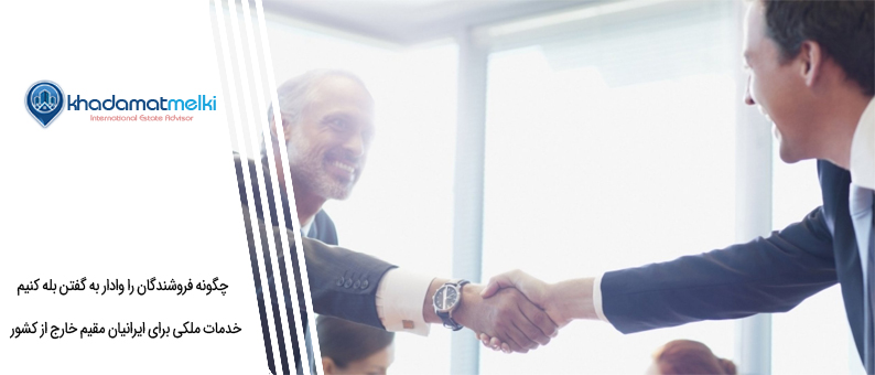 چگونه فروشندگان را وادار به گفتن بله کنیم هنگامی که برای مذاکره درمورد یک معامله با یک فروشنده با انگیزه ملاقات می کنید چند مرحله مشخص وجود دارد که باید برای گرفتن بله انجام دهید. از فروشنده بخواهید خانه را به شما نشان دهد هدف شما ایجاد ارتباط با فروشنده. خرید و فروش ملک را به مشاور املاک بسپارید که به صورت 24 ساعته اماده خدمات ملکی به شما هموطنان عزیز در داخل و خارج ایران هستیم